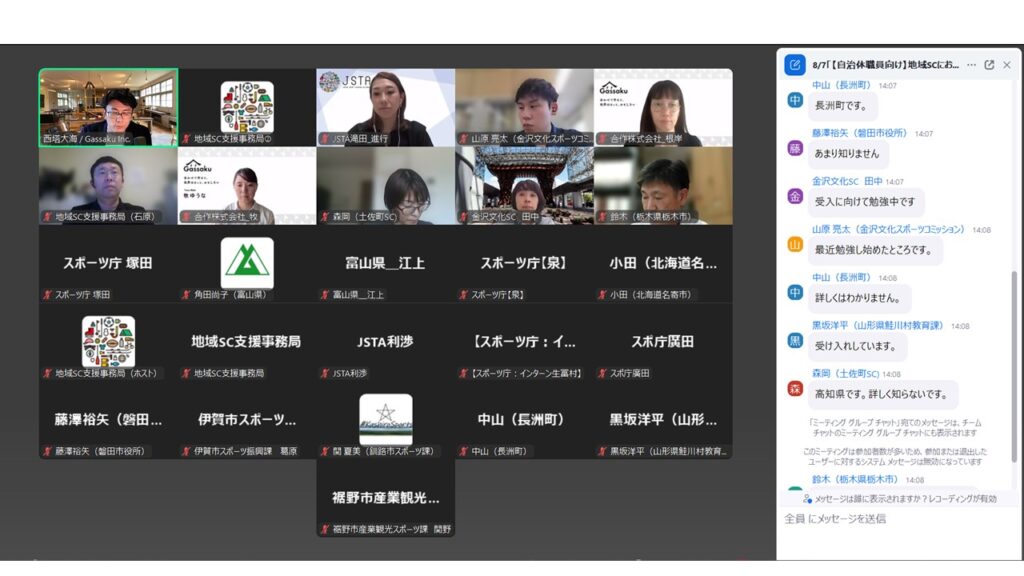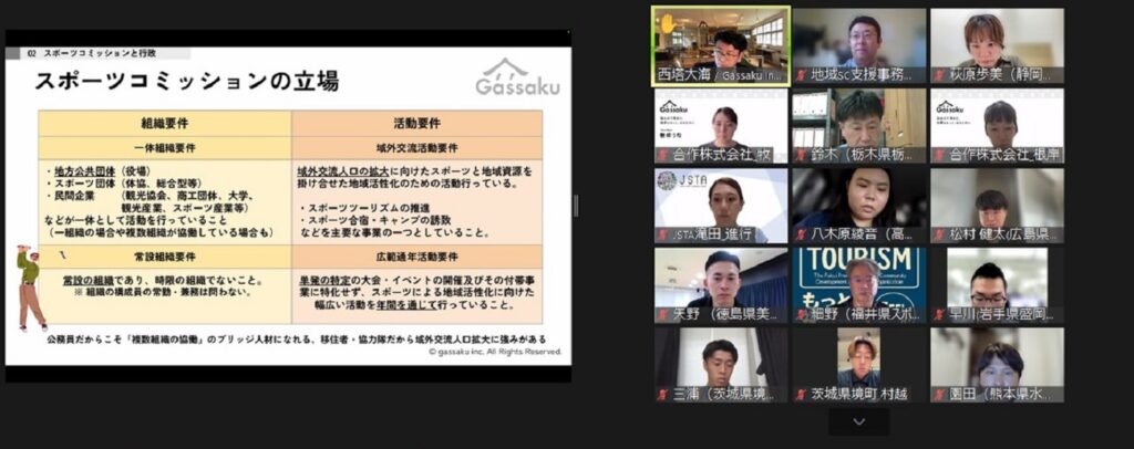 地域スポーツコミッション(以下「地域SC」)の活動を担う地域おこし協力隊および自治体職員を対象に、地域SCでの活動基盤づくりに向けた知識の習得、各種制度の理解促進や、協力隊の任期終了後を見据えたキャリア設計を目的として、全3回の研修が開催されました。