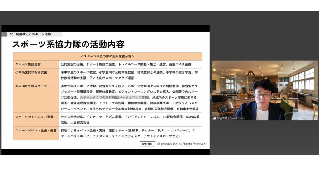 第1回では、協力隊制度の基本的な構造や、地域SCと行政との関係、自治体予算の仕組みについて解説。地域SCに所属する協力隊は、スポーツコミッションの一員であり、同時に「地域おこし協力隊」「公務員」「地域住民・移住者」としての立場を兼ね備えています。こうした異なる立場を理解し、相互に尊重し合う関係性づくりの重要性が強調されました。