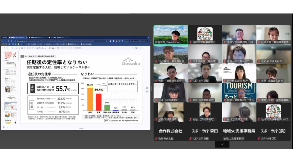前半では、制度の概要のほか、近年の制度改正のポイント、地域SCにおける協力隊の位置づけについてなどの基礎的な知識を確認。あわせて、任期終了後の進路傾向なども共有され、制度全体の流れを俯瞰的にとらえる時間となりました。